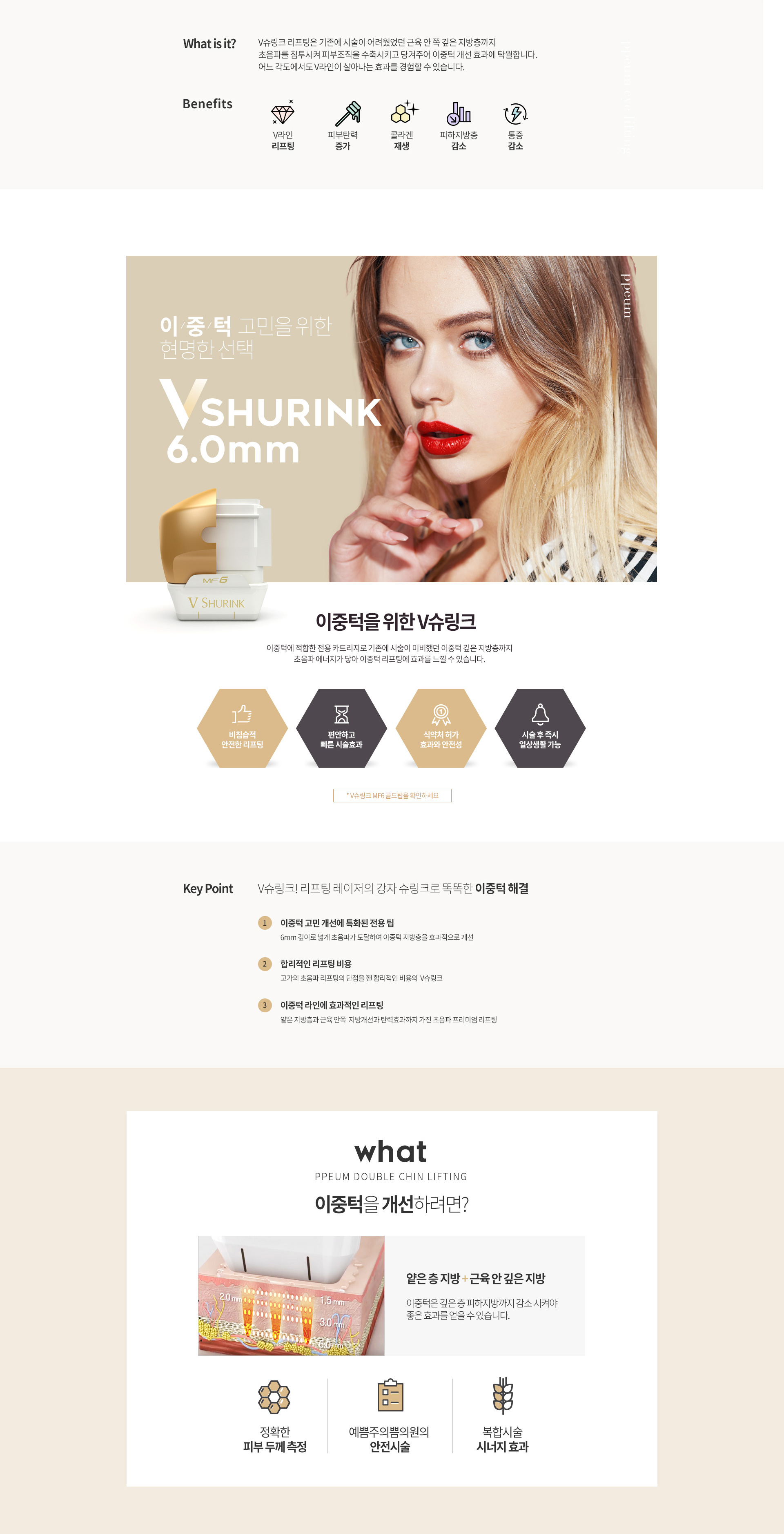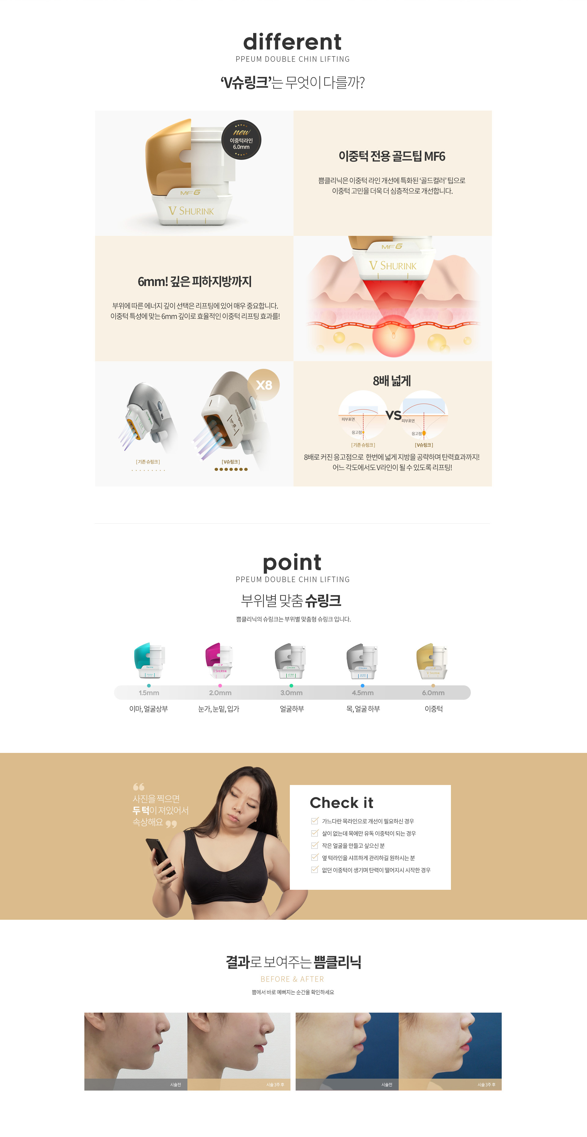 V슈링크 리프팅은 기존에 시술이 어려웠었던 근육 안 쪽 깊은 지방측까지 초음파를 침투시켜 피부조직을 수축시키고 당겨주어 이중턱 개선 효과에 탁월합니다. 어느 각도에서도 V라인이 살아나는 효과를 경험할 수 있습니다.